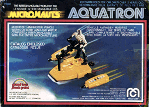 This is the Canadian Grand Toys version, but is essentially the same. Definitely one of the more interesting of the Micronauts vehicles, the Aquatron came with a battery-powered motor which could be attached to the underside of the vessel. This enabled it to power itself in water! The motor that came with it is the same blue and white motor used to power the Hydro Copter.