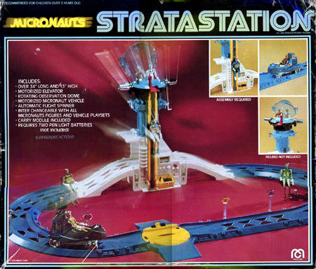 Hey! it's the Stratastation! This is the first playset ever for the Micronauts, and certainly one of the coolest. The box photo almost seems Japanese in style rather than in sync with the rest of the Micronauts box art. The photo pretty much depicts everything that you get.