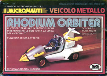 Whelp, it's the standard ol' Rhodium Orbiter, only this box is from the Italian version. Nothing new or different here. It's a shame that this vehicle doesn't include the see-through canopy as originally intended. It seems incomplete without it. Still, this is one of the cooler vehicles, tricked out seventies style with drag pipes in front and back and a great spinning projectile on the front. This vehicle also has some of the most durable wheels of any of the toys in the Micronauts line.