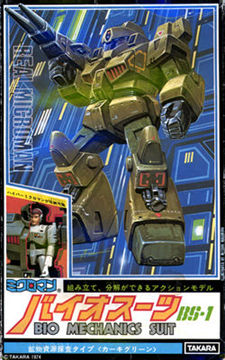 Front and back box art for the Real Microman Bio Mechanics Suit 01. This particular one is greenish brown in color. As you can guess, this is a large departure from the original Microman, and even from the Transformer-like post-80's Microman pieces. This is pretty much a Mecha, and a nice one at that.One thing you can't tell from the box art is that this is a snap-together model kit! Even the figure, shown at bottom left on the front of the box, is a snap-together guy! This kit was meant to be put together and painted.