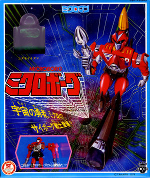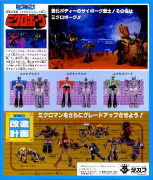 Below is the front and back box art for the Microborg series of figures. There are three Microborgs; red, green and blue, all of which are shown, with their monochromatic sidekicks, on the back of the box. The three robot compatriots that come with each Microborg are essentially snap model figures that you must assemble yourself. They are made to be built up and painted. The Microborgs and their sidekicks are interchangeable with each other, allowing for various permutations.