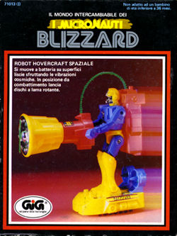 The Italian version of the Microman Blizzard. Blizzard is a kind of anomoly from the Microman line. He was introduced late in the series when Takara was attempting to breathe fresh life into the sagging Microman line. Blizzard is battery-powered, sports a hoverboard and a large cannon that fires off large green spinners! He is a very inventive design for his time.