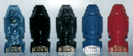 The two pictures at the bottom show the five man set opened. These are identical to the M15X series from the original Microman line by Takara, with the exception of the smoke/clear figure in the center. He is the new color variation for this set in conjunction with the gold figure that was released on it's own. A close-up of the smoke/clear figure can be seen by clicking on the image of him in the line-up.