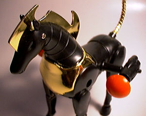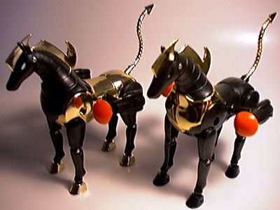 Below are three photos of New Megas. The first is an overall shot, the second, a close-up, and the third a visual comparison between Nuovi Megas and the classic Megas. The differences are: Nuovi Megas doesn't have painted eyes; his hooves are black instead of gold; his chest plate is gold instead of black; his body is black instead of gold. The Nuovi Megas is also made of somewhat inferior quality plastic, as all the Nuovi series were.