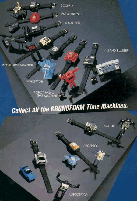 Below is a group picture of all the Time Machines available in the Kronoform line. They are, in order of appearance: Scorpia; Autokron I; X-Kalibor; Robot Time Machine; Inviceptor; Robot Radio Time Machine; Hi-Band Blaster; Kaltor; Deceptor and Autoceptor. Another Time Machine that isn't pictured is Autokron II.